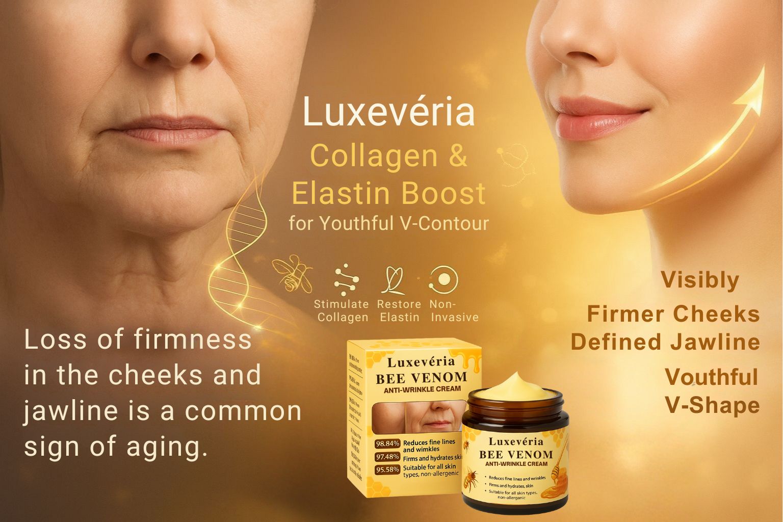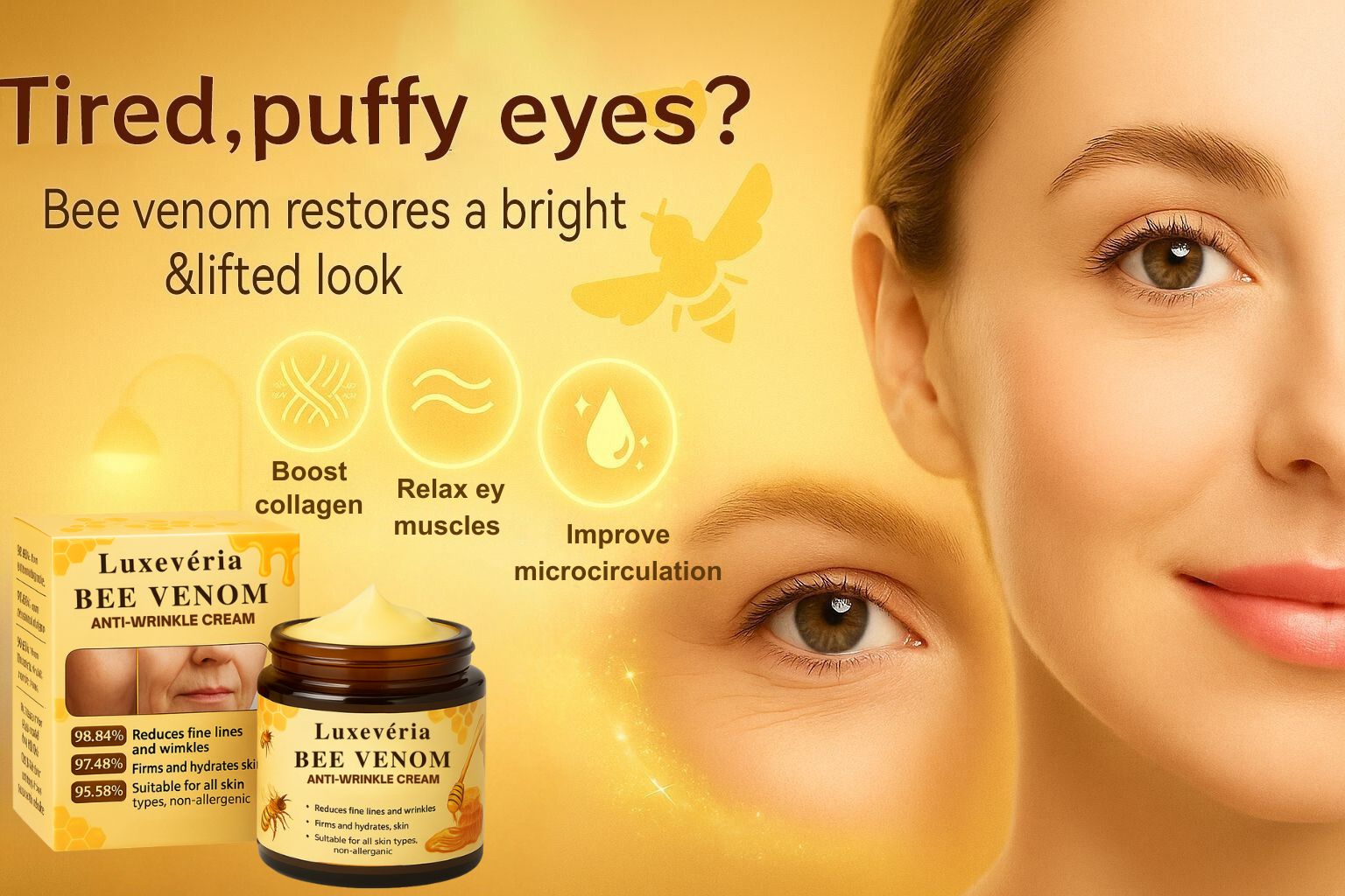 Tired eyes, puffiness, and drooping lids often betray age before anything else. Luxevéria delivers targeted repair with bee venom peptides that boost collagen, relax fine eye muscles, and improve microcirculation. This triple-action formula visibly lifts eyelids, fades dark circles, and smooths fine lines for a refreshed, brighter eye area.