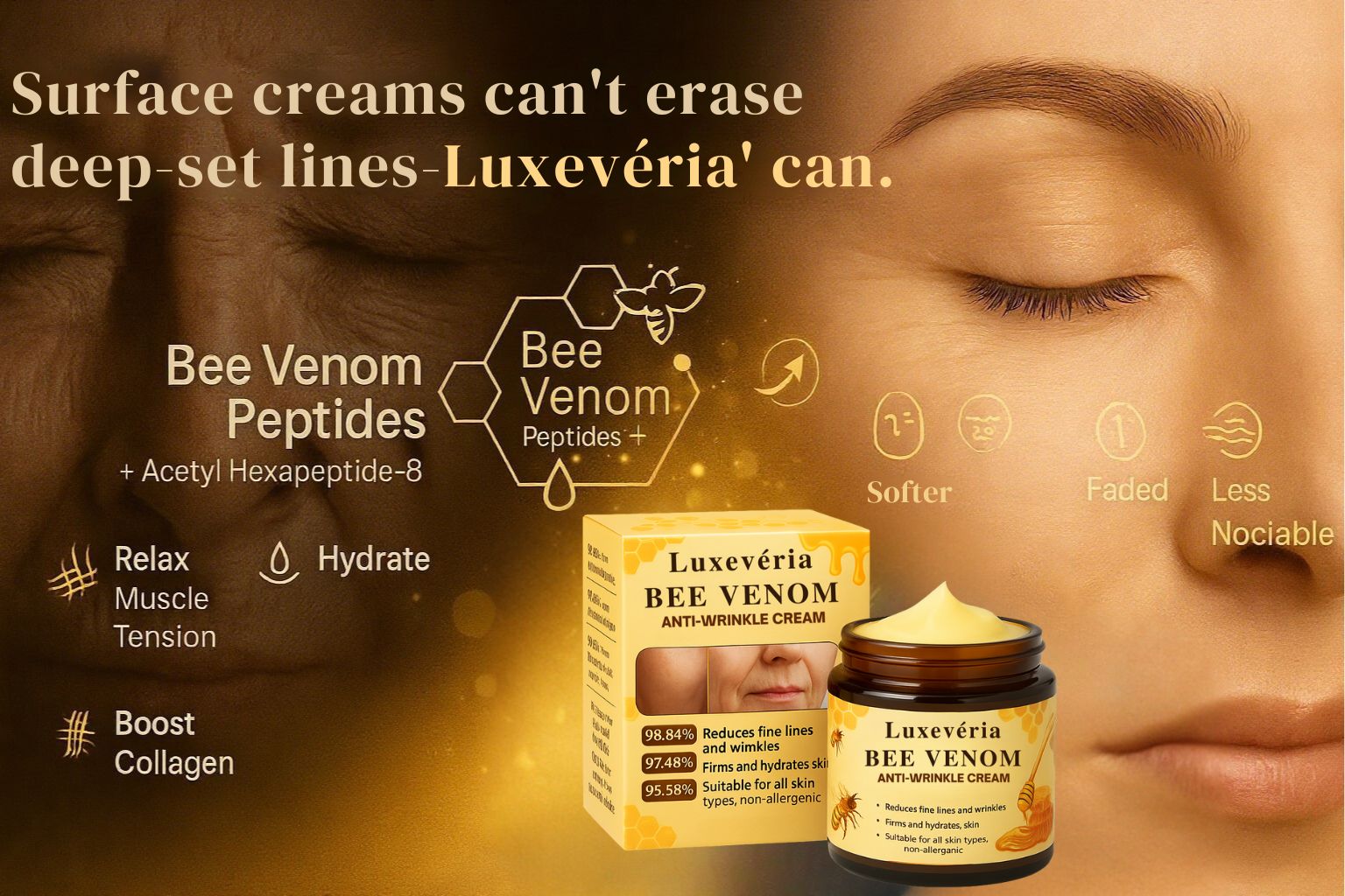 Surface creams can’t erase deep-set lines—but Luxevéria can. Its advanced blend of bee venom peptides and Acetyl Hexapeptide-8 mimics Botox to relax muscle tension while hydrating and boosting collagen. Deep forehead creases, crow’s feet, and laugh lines become softer and less visible with continued use.